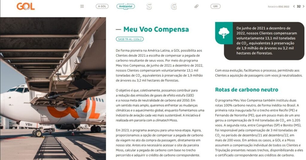 Desde junho de 2021, a Gol oferecia aos passageiros a opção de pagar uma taxa adicional para compensar as emissões de gases do efeito estufa geradas nos voos. O programa afirmava que a emissão de carbono seria neutralizada com a compra de créditos de carbono, títulos que representam a redução, remoção ou prevenção de emissões equivalentes a uma tonelada de dióxido de carbono.