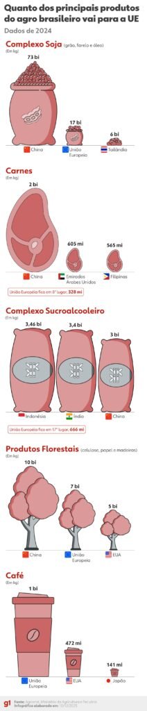 O Brasil, um dos maiores produtores de alimentos do mundo, deve ser um grande beneficiário do acordo UE-Mercosul. O bloco europeu já é o segundo maior cliente do agro brasileiro, atrás da China e à frente dos Estados Unidos.