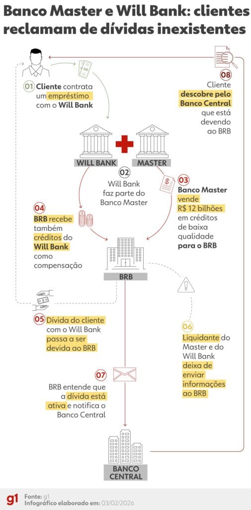 Clientes que nunca tiveram relacionamento direto com o BRB encontraram registros de dívidas em aberto ou em atraso no SCR. Ao buscar esclarecimentos, o BRB informou que deixou de receber do liquidante, responsável pela gestão da liquidação do Will Bank e do Master, as informações necessárias para atualizar o status desses créditos, o que impede a baixa correta das operações.