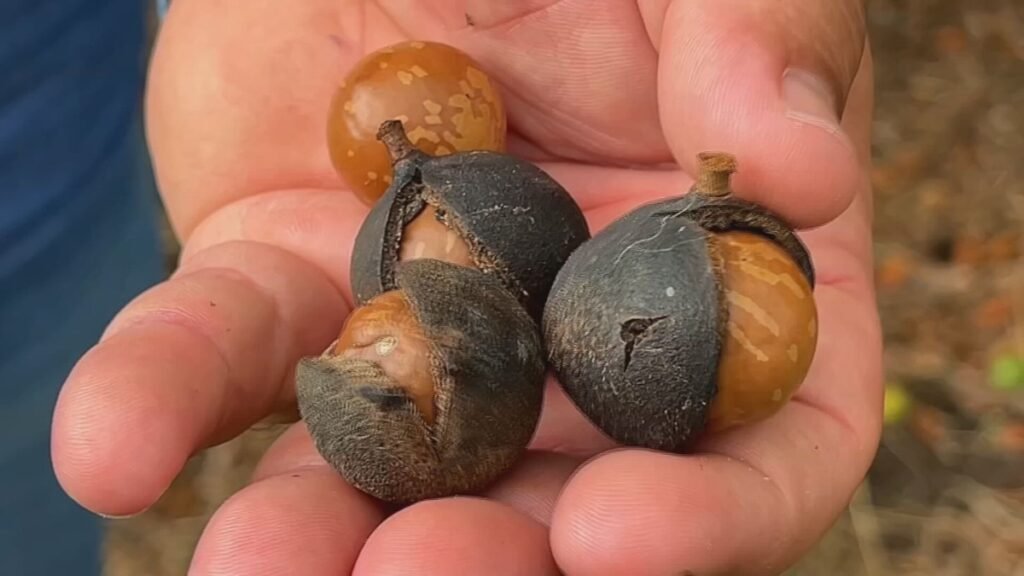 A macadâmia, noz originária da Austrália, chegou ao Brasil na década de 1970, inicialmente em São Paulo. O amadurecimento do fruto ocorre de dentro para fora, com a casca externa verde ocultando a maturação interna. Após cerca de 15 dias do amadurecimento, o fruto começa a cair e, em uma semana, a casca entreaberta permite o início da colheita.