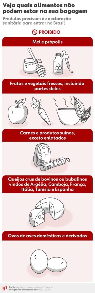 Desde 4 de fevereiro, o Ministério da Agricultura estabeleceu novas regras para a entrada de alimentos na bagagem de viajantes no Brasil, exigindo autorização para determinados produtos. O objetivo é evitar a introdução de pragas e doenças que possam comprometer a agricultura, a pecuária e a saúde pública.