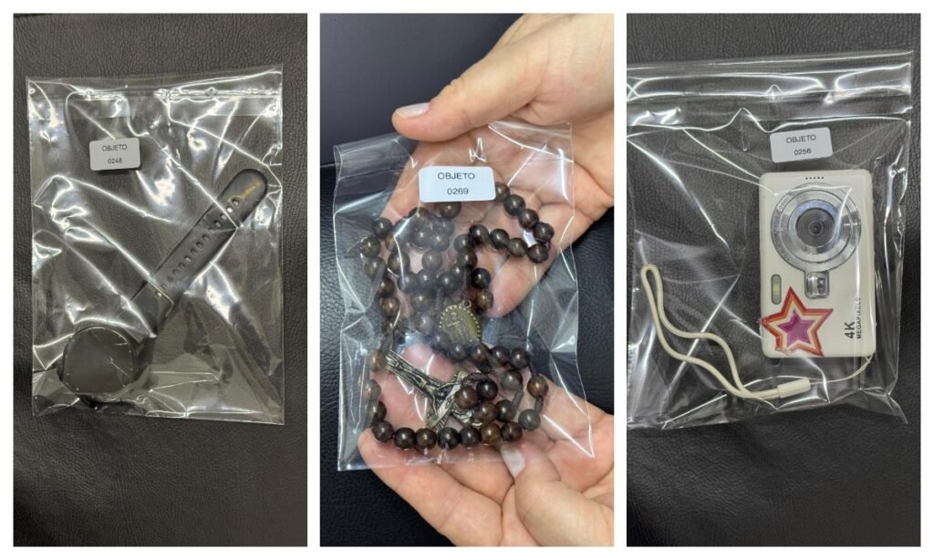 O processo inclui a abertura e descrição minuciosa de mochilas, detalhando cor, conteúdo e características dos itens encontrados, como documentos, carregadores e óculos. Esse procedimento aumenta a precisão na identificação dos donos.