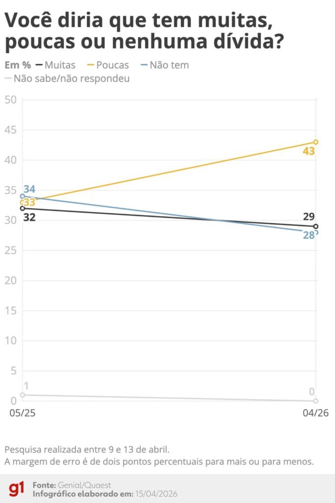 Além dos preços, o endividamento das famílias avançou nos últimos meses. De março do ano passado até agora, o percentual de entrevistados com dívidas aumentou de 65% para 72%. A pesquisa segmenta esses números em 29% com muitas dívidas, 43% com poucas dívidas e 28% sem dívidas. A proporção dos que afirmam não ter dívidas caiu em relação a maio de 2025, quando era de 34%.